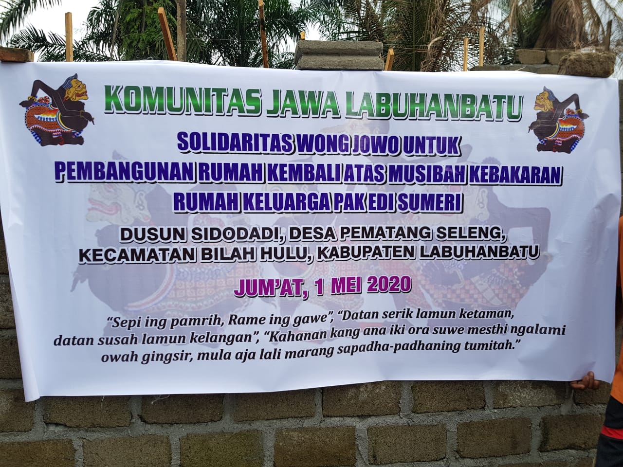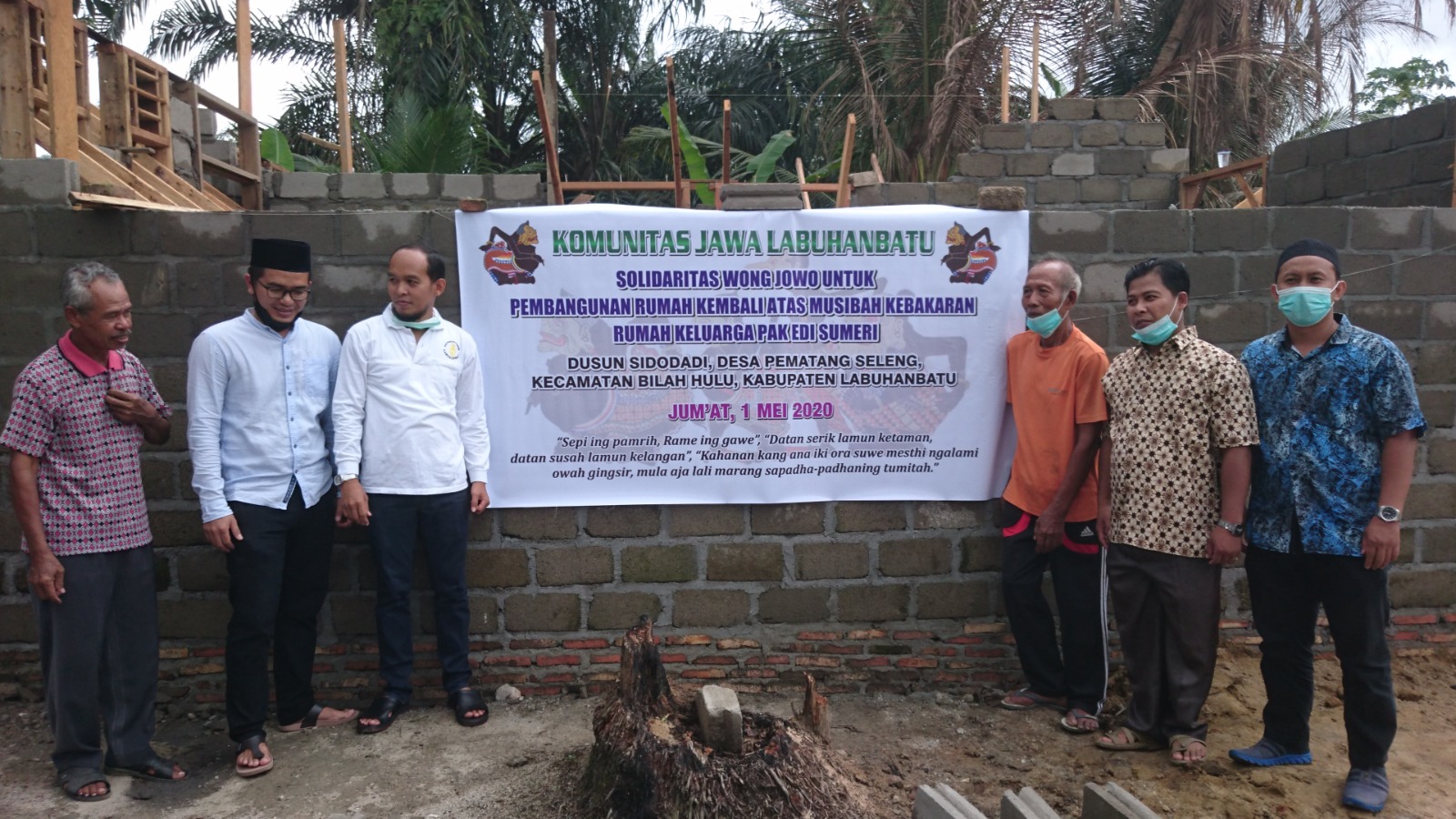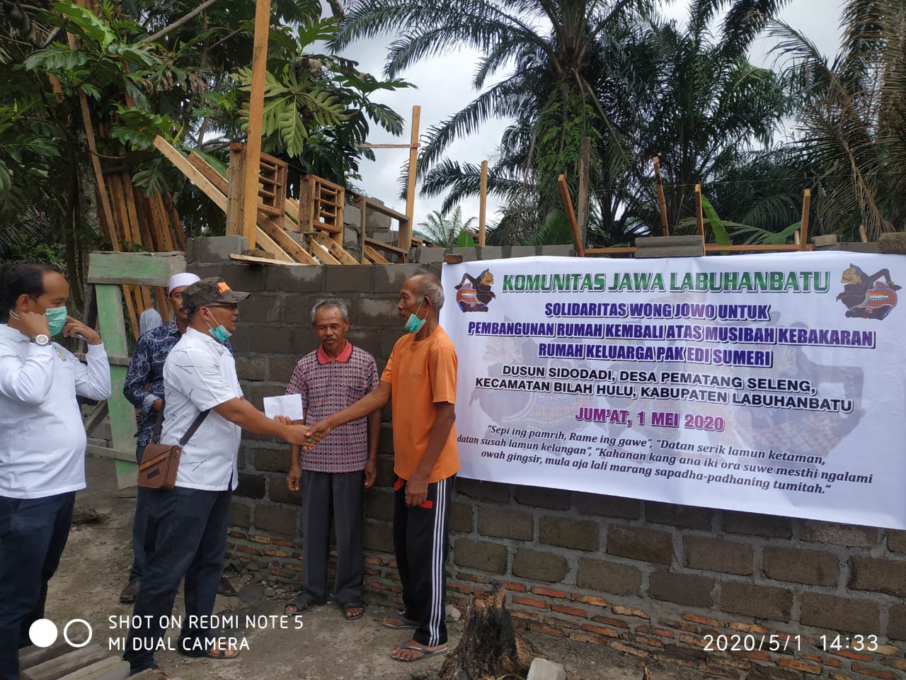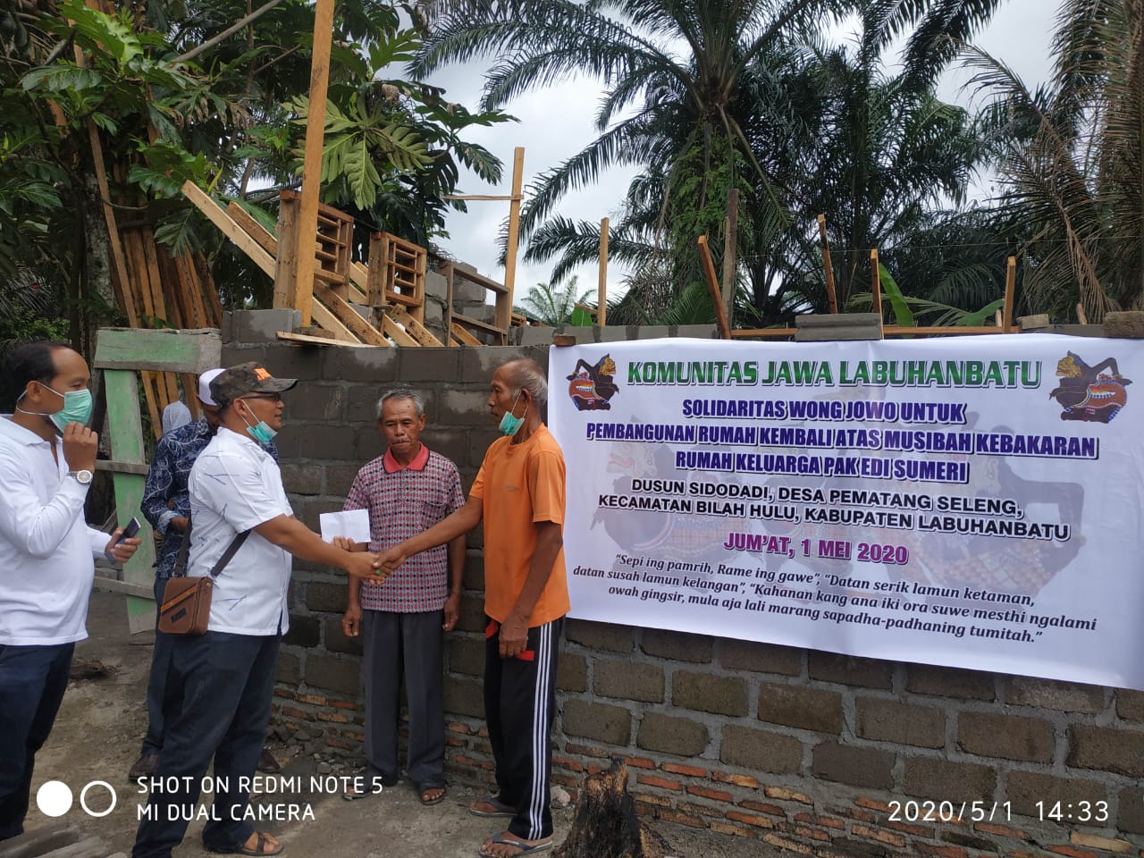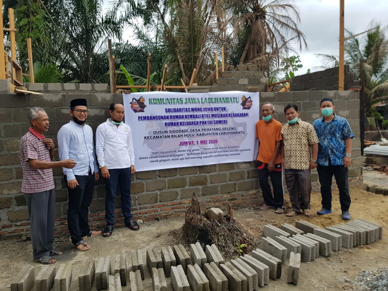Bantuan Donasi dibelikan Bahan material bangunan yaitu 32 Zak Semen (@50 Kg), 2,5 Kodi Seng (Uk. 8 kaki), dan Uang Tunai Rp 1.100.000,-. Semua diserahkan langsung kepada ahli musibah Bapak Edi Sumeri yang di saksikan oleh Kades Pematang Seleng dan Ketua BPD Pematang Seleng (selaku ketua pembangunan rumah) dan anggota Komunitas Jawa Labuhanbatu yang ikut berhadir dalam penyerahan bantuan. Semoga Berkah dan Bermanfaat.
