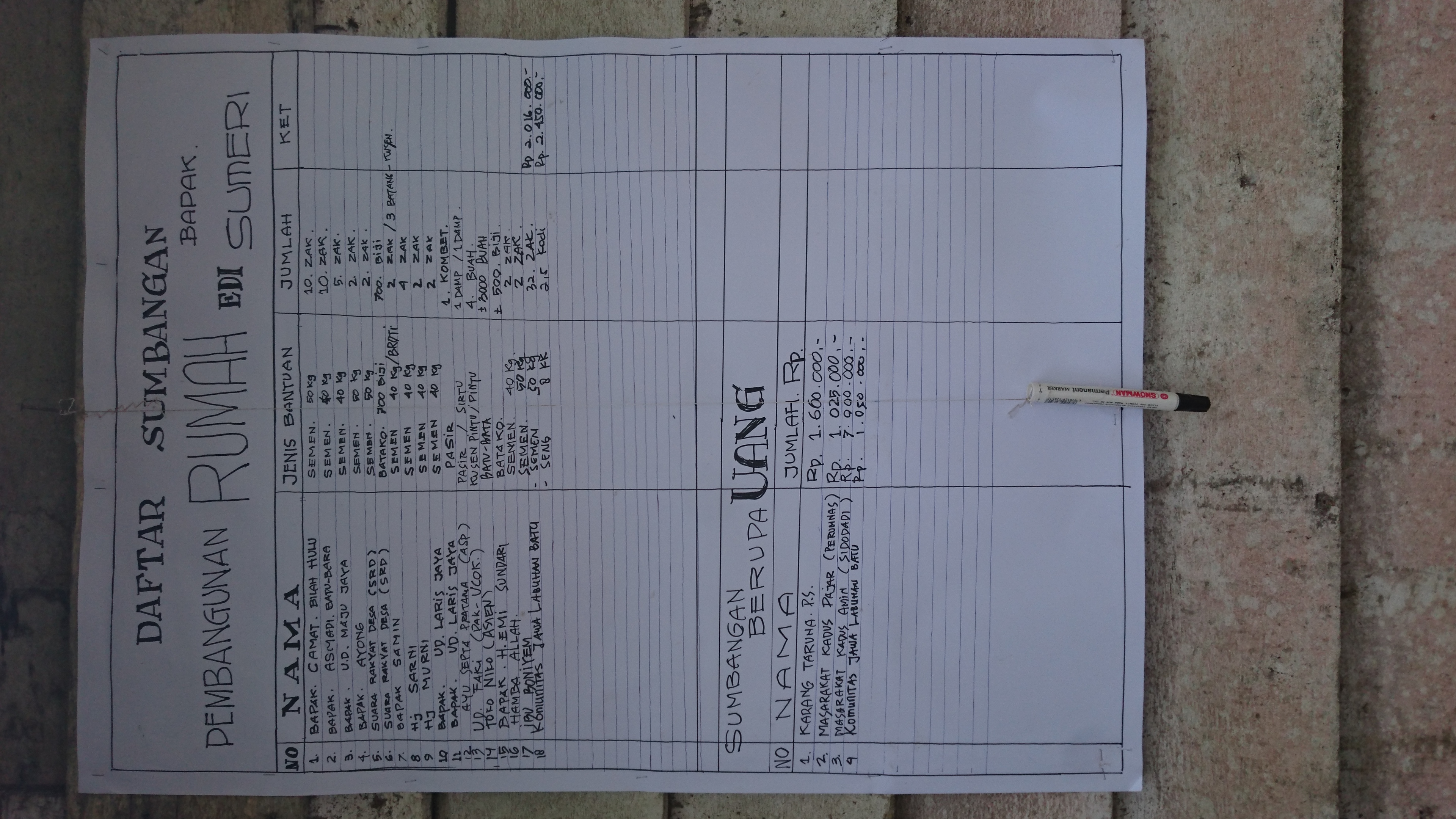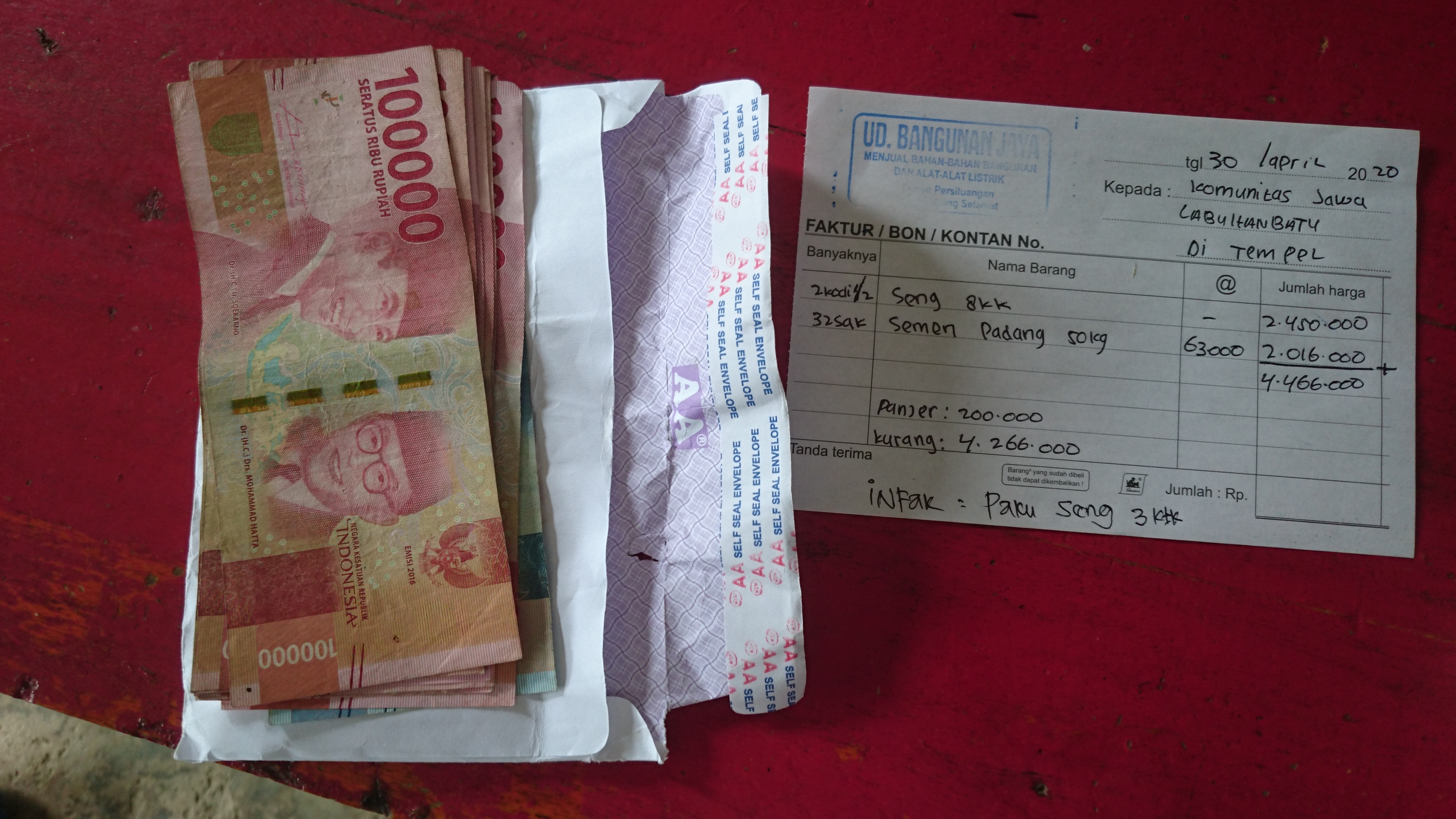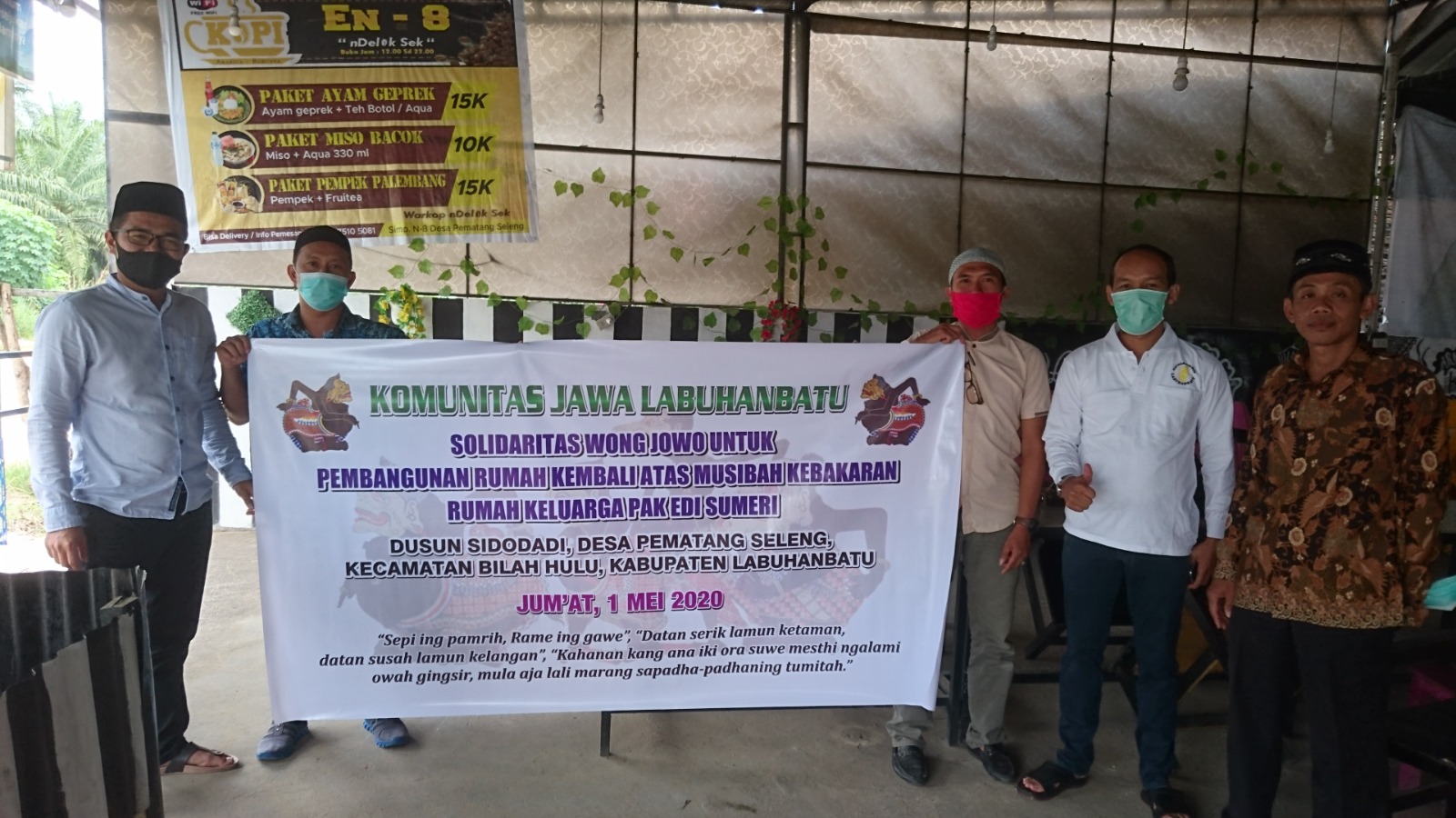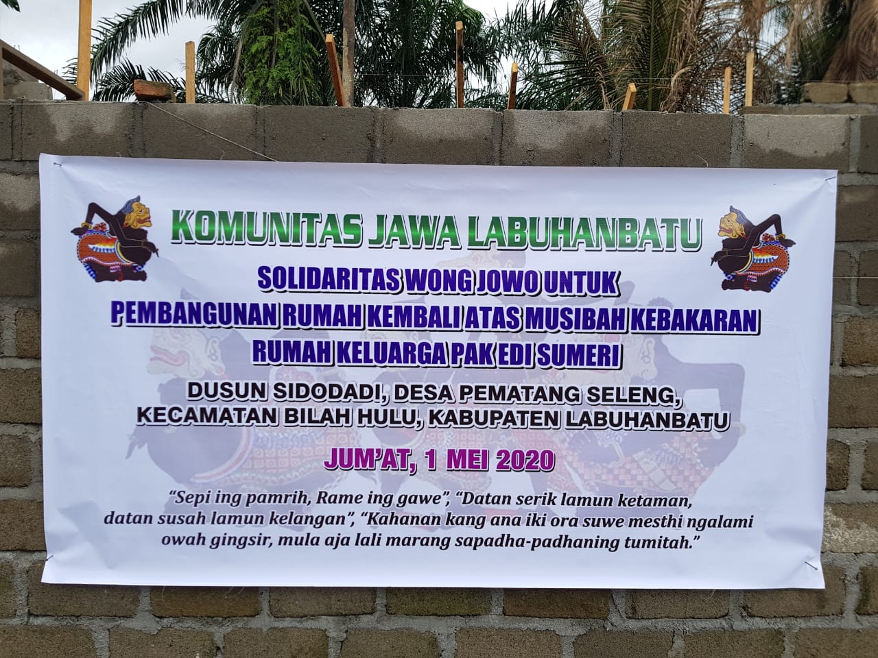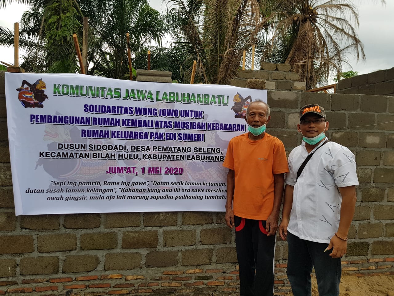 Bantuan Donasi dibelikan Bahan material bangunan yaitu 32 Zak Semen (@50 Kg), 2,5 Kodi Seng (Uk. 8 kaki), dan Uang Tunai Rp 1.100.000,-. Semua diserahkan langsung kepada ahli musibah Bapak Edi Sumeri yang di saksikan oleh Kades Pematang Seleng dan Ketua BPD Pematang Seleng (selaku ketua pembangunan rumah) dan anggota Komunitas Jawa Labuhanbatu yang ikut berhadir dalam penyerahan bantuan. Semoga Berkah dan Bermanfaat.